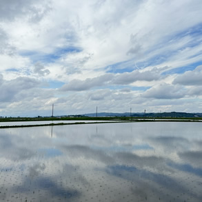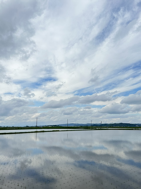 苗を植えたばかりの田んぼ。まるでウユニ塩湖と思うくらい。この時期ならではですね