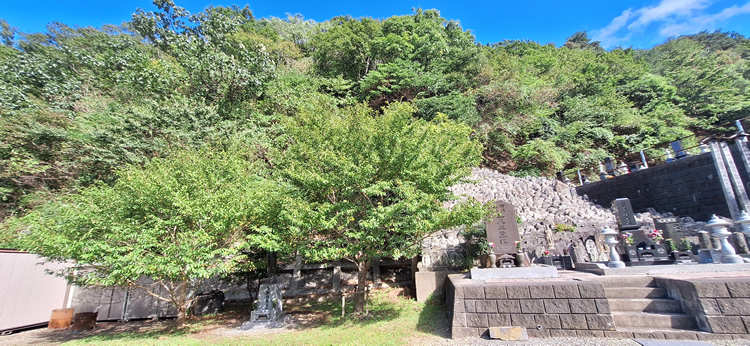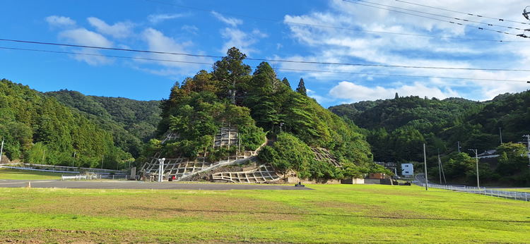 船越の天王山は船魂神社。青空と森林みどり。手前の敷地には震災前多数の家がありました。