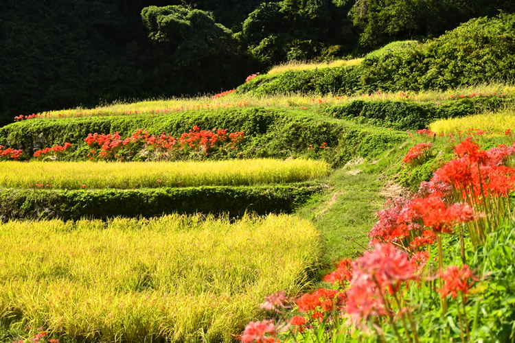 稲穂が黄金色一色に、赤い曼珠沙華が、鮮やかでした。