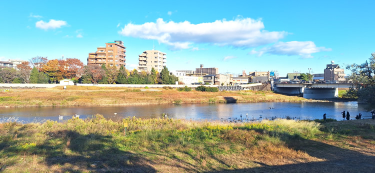 広瀬川宮沢橋は工事中、川沿いには大きな木々、ジョギングコースには最高かな?