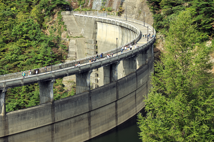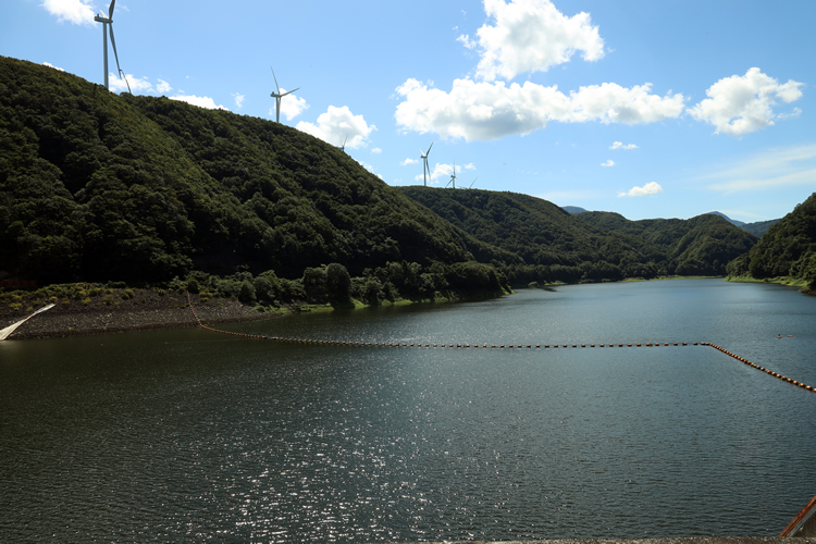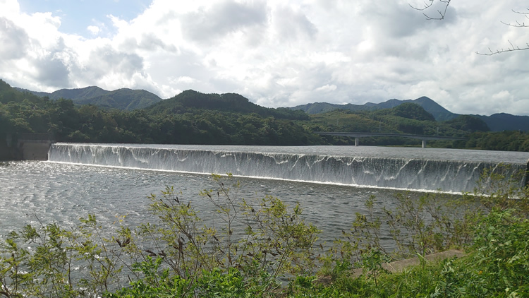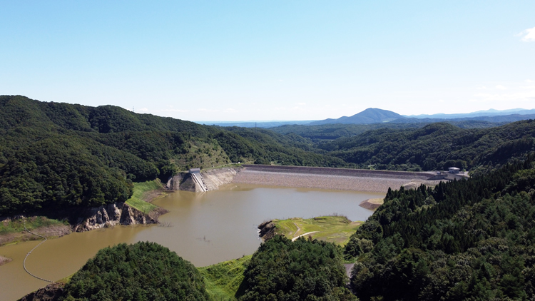 漆沢ダムの水は、何とか持ちこたえてるようです。山並みの濃い緑が綺麗でした。