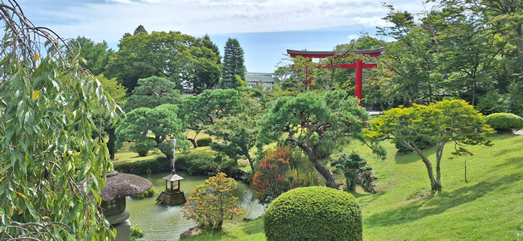 広い緑の庭園と赤い鳥居、天候にも恵まれご利益ありそう。