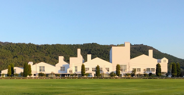 日課のウォーキングコース上の風景です。朝日が建物や緑に注がれ、とっても綺麗な風景を見せられると、さぁ、今日も頑張ろう!と心に誓います。