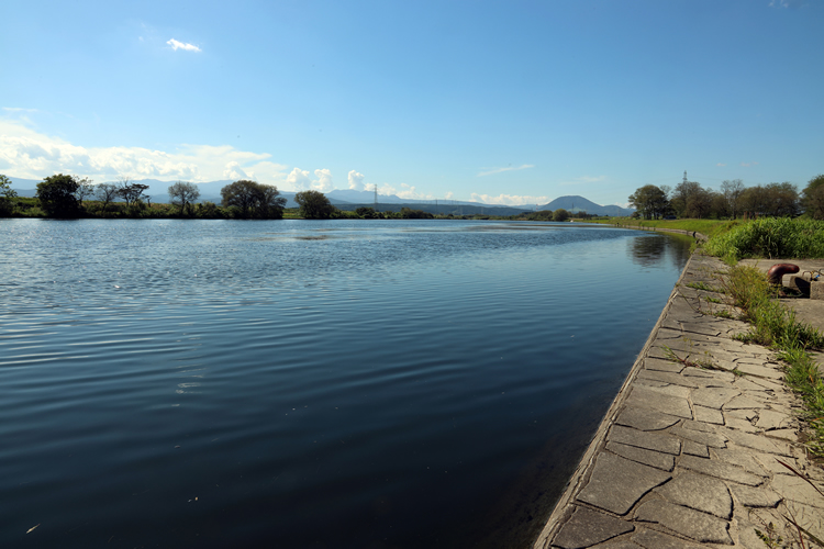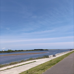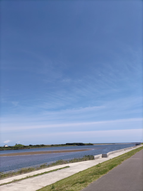 鳴瀬川のカヌー競技場は、穏やかで、青色に染まってました。