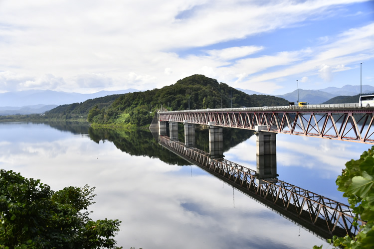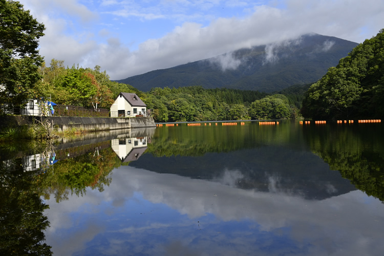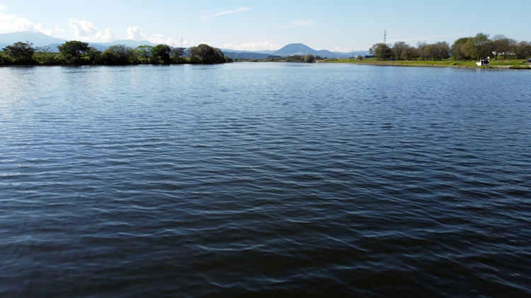 西には蔵王連峰を望む美しい景観。風の穏やかだった釜房湖は、まるで鏡のようでした。