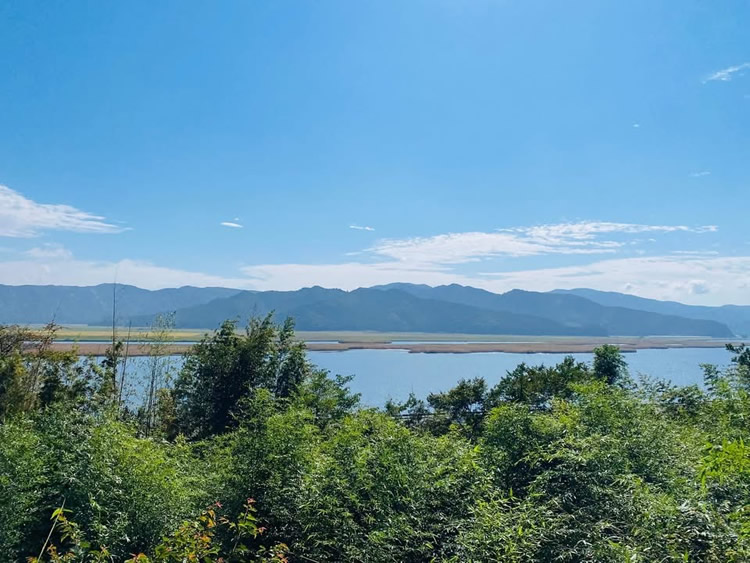 水面ギリギリから見る薬莱山と船形山、青とみどりがとても綺麗でした。