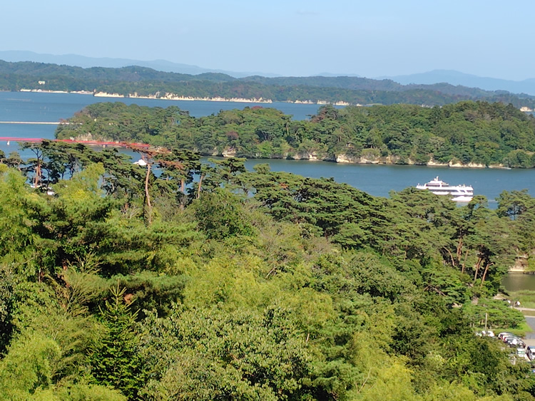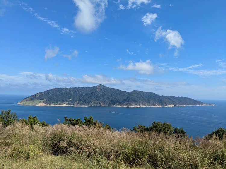 青い空、碧い海、そして白い雲。金華山に向かう小さな船の白波が綺麗で、秋晴れの日の1枚。