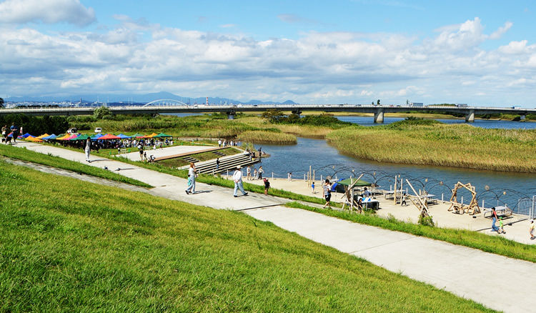 かわまちテラスから名取川の中州、堤防の風景です。夏の名残りを多くの人が楽しんでいました。