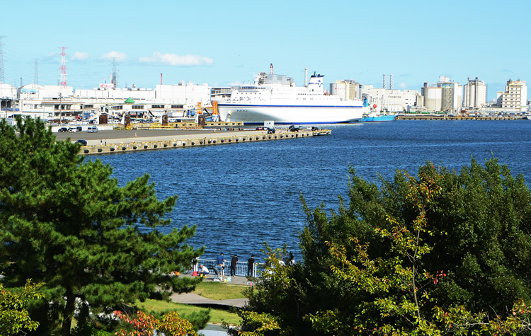 仙台新港に停泊する大型フェリーは公園の緑に包まれ、ゆったりと休息しているようでした。