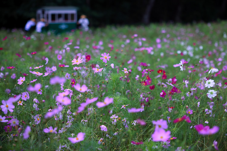 人車に乗ってコスモスを眺めるのは楽しそうですが、その人車を押して走らせるのは大変そうです。