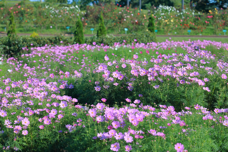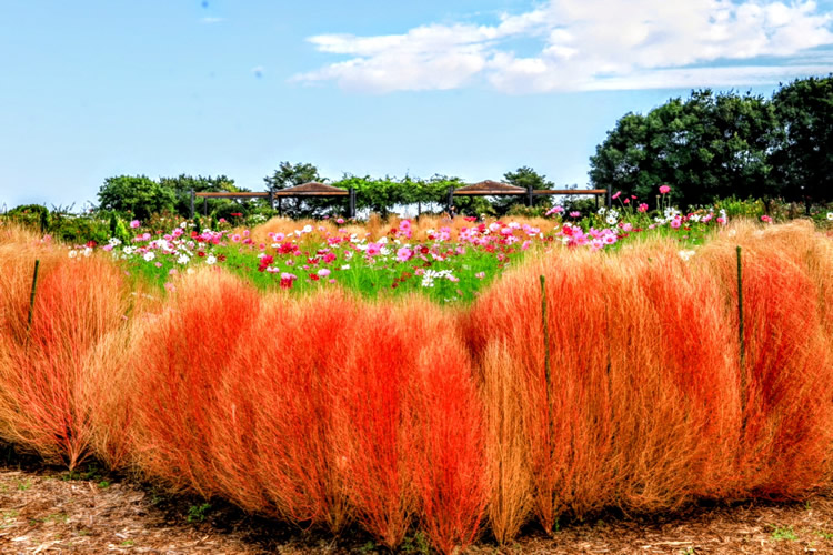 奥に、木々のみどりを中央には緑の葉、コスモスを入れました。手前には、赤くなりましたコキアを取り入れまして撮影して見ました一枚です。天気にも恵まれまして良かったです。