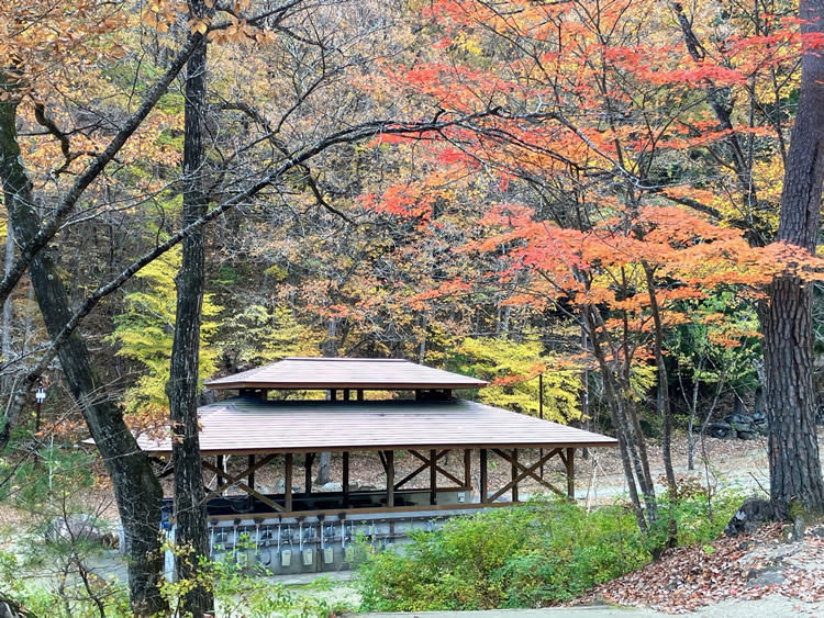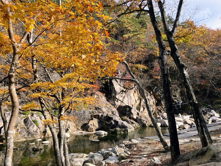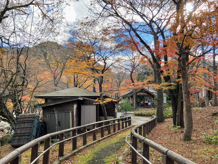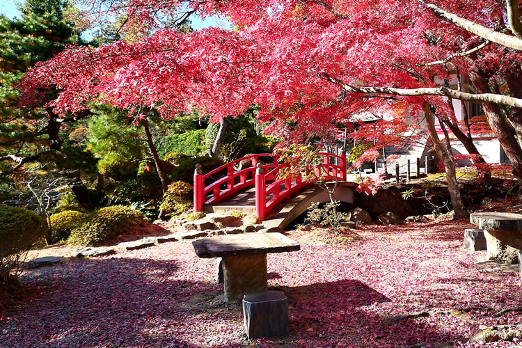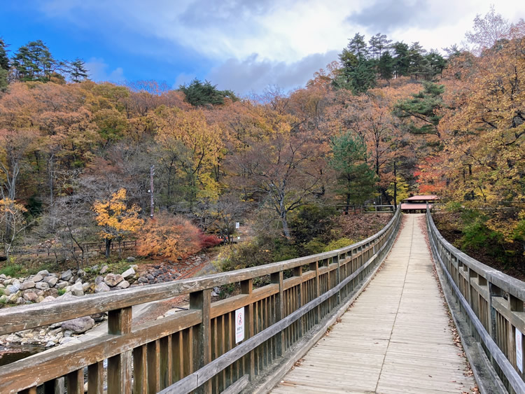 真っ赤なもみじの絨毯を踏みしめて、赤い橋を渡る心地良さを味わいました。