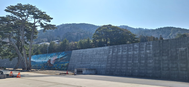 防潮堤壁画には、名振の「おめつき」。海からいつも見える松と郷土祭りのおめつき。