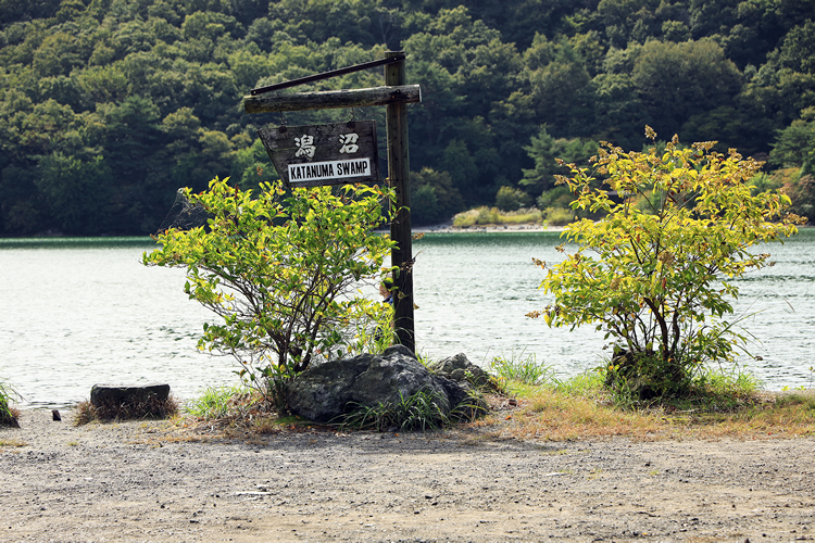 鳴子の潟沼、案内板の東と西で、紅葉の始まりを感じて来ました。潟沼いい感じ。