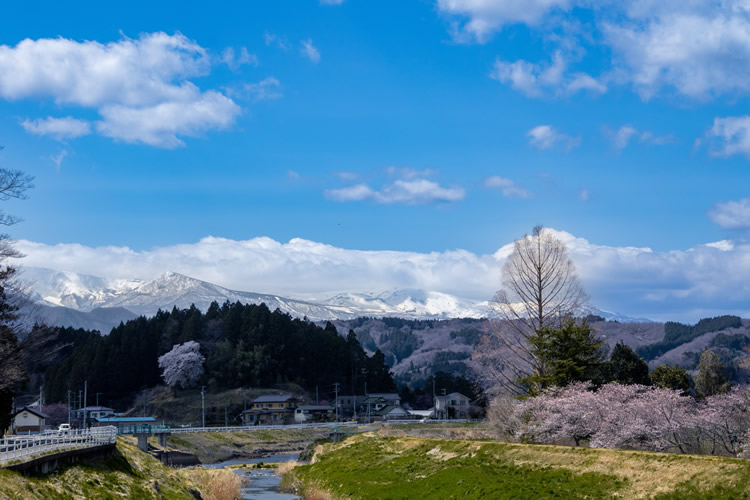 残雪の蔵王と桜の花が綺麗で足を止めて撮影しました。