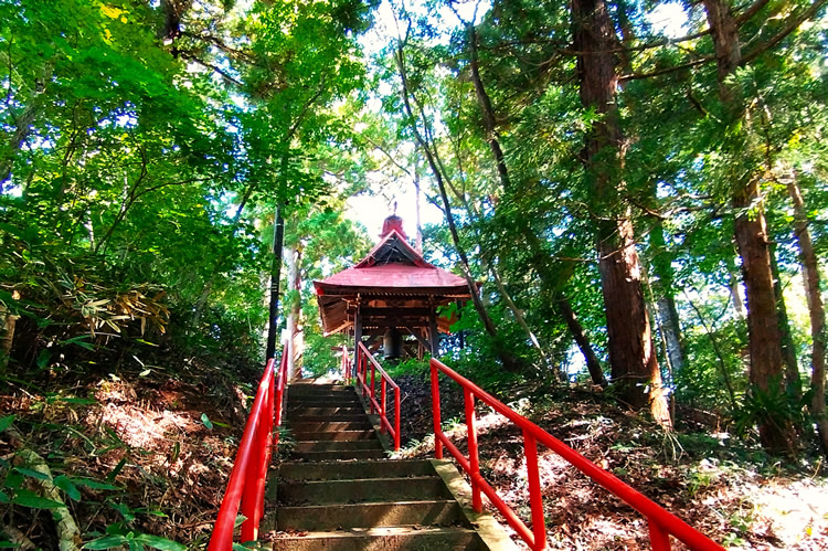 参道を登って行くと、赤い屋根の鐘楼がお出迎え。