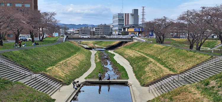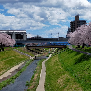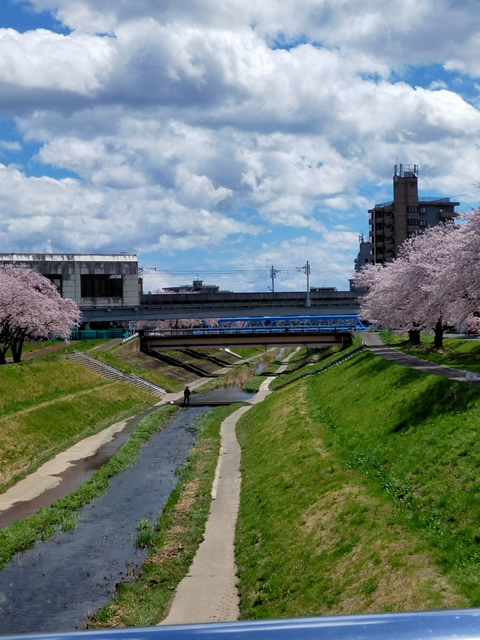 地下鉄の富沢駅から笊川沿い。両サイドは桜、今度はサクラ開花後かな。